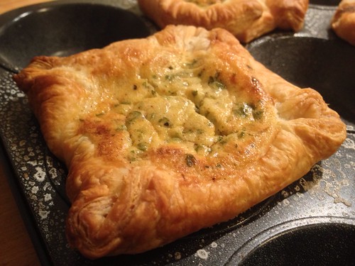 - Den Blätterteig in etwa 10x10cm große Stücke schneiden.